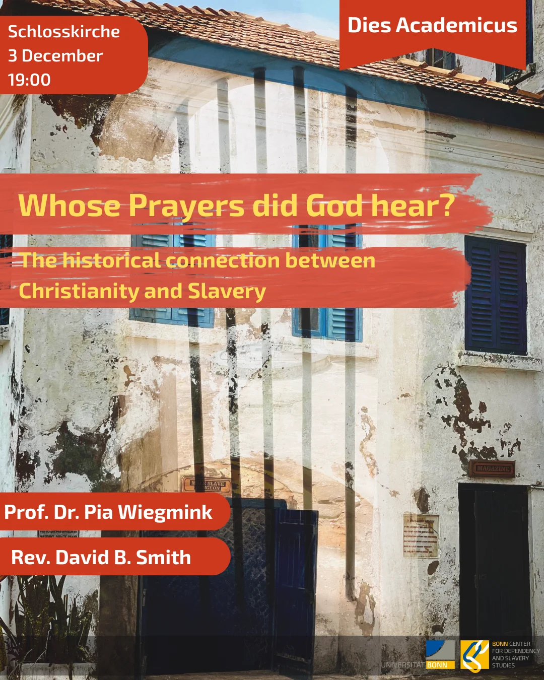 Foto der Kapelle und des Büros der Society for the Propagation of the Gospel im Cape Coast Castle (Ghana), das auf einem großen Tunnel zum „Male Slave Dungeon“ steht (DBS 2023). Blick auf den „Female Slave Dungeon“ aus einem Raum unterhalb der Niederländisch-Reformierten Kirche im Elmina Castle, Cape Coast, Ghana.