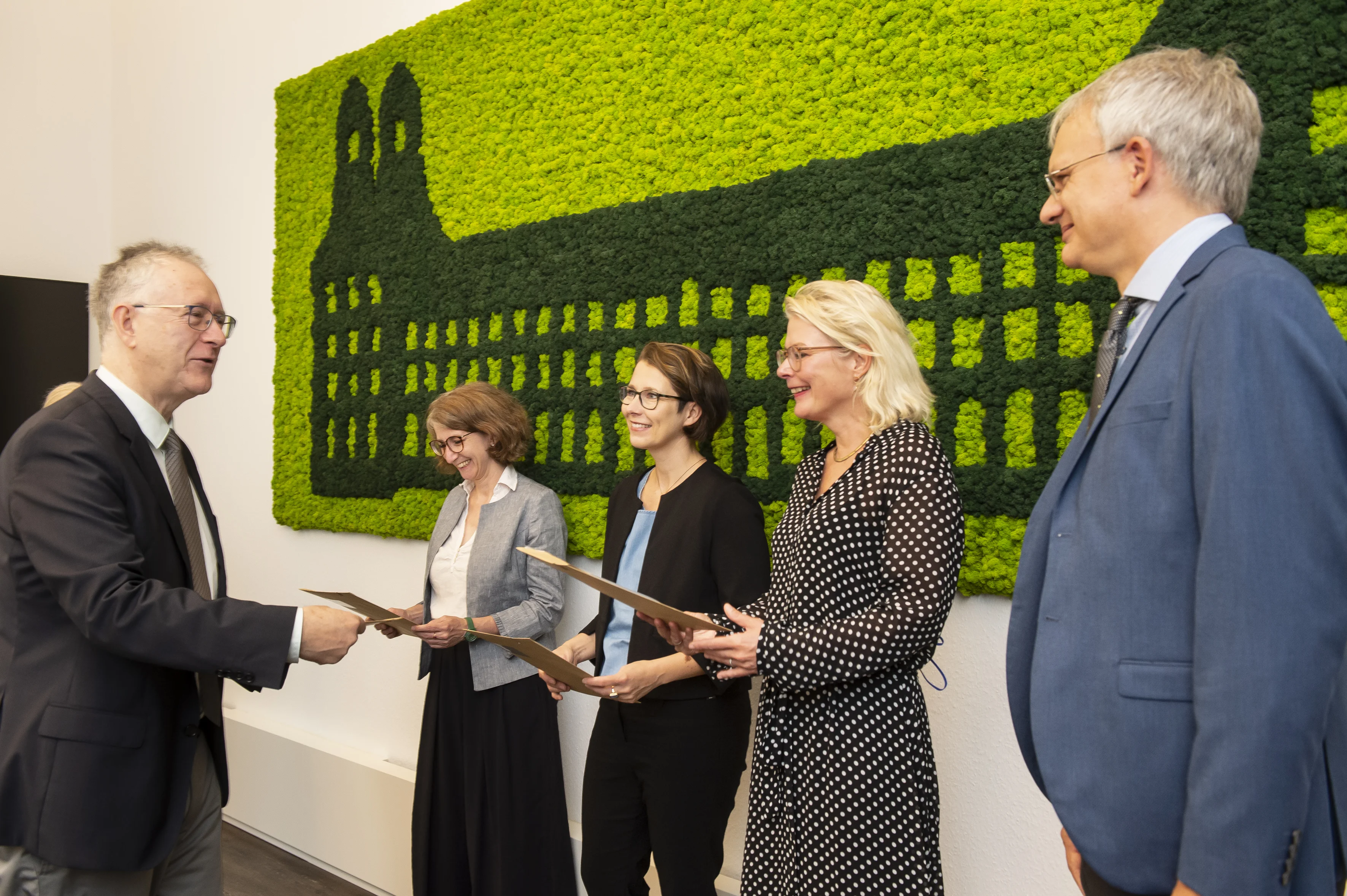 from left to right: Rector Prof. Dr. Dr. h. c. Michael Hoch with Prof. Dr. Claudia Jarzebowski, Prof. Dr. Julia Hillner, Prof. Dr. Pia Wiegmink und Prof. Dr. Christoph Witzenrath